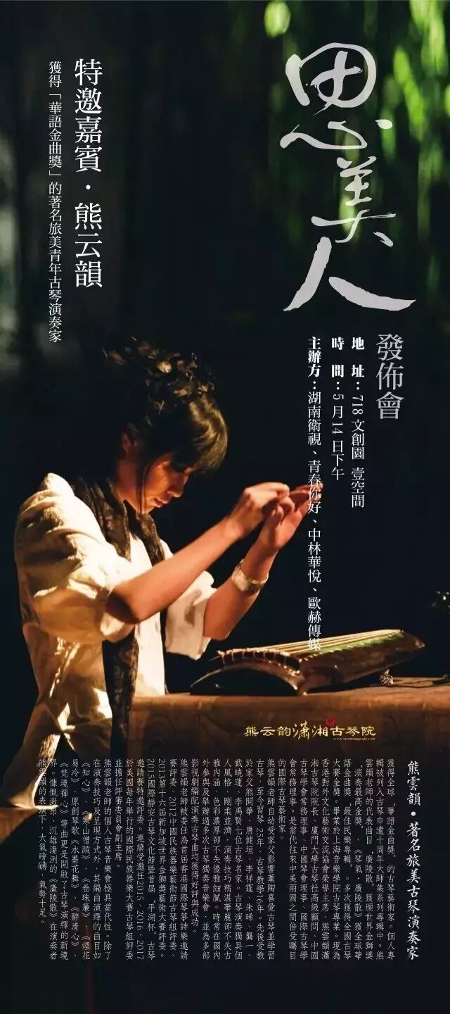 5月14日,刚荣获[华语金曲奖]的著名旅美青年古琴演奏家熊云韵获邀出席于北京举行的湖南卫视大型历史传奇剧《思美人》宣传曲新闻发布会并担任特邀演奏嘉宾。在新闻发布会上,熊云韵用她精湛的演奏风格演绎了其代表曲目《广陵散》、古琴名曲《流水》以及《寒山僧踪》,获得全场最热烈的掌声。